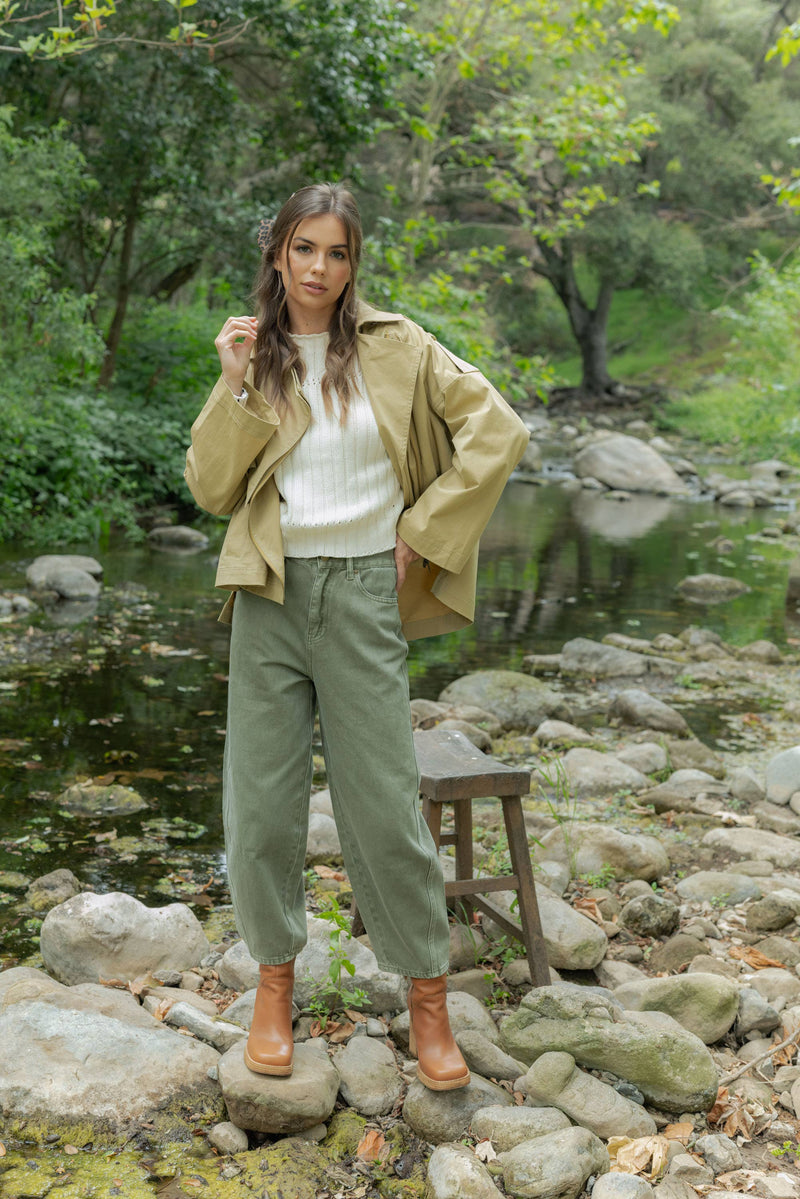 The washed olive finish gives them a lived-in, understated sophistication, making them endlessly versatile for both casual and elevated looks. Perfect with a simple tank for laid-back days or styled with a crisp shirt for a more polished edge, these pants are the definition of easy, contemporary style.