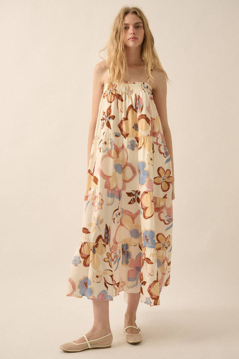 Light, feminine, and effortlessly graceful, the Indiana Cream Maxi blends romantic detailing with easy elegance. Crafted from softly textured floral fabric, it features a straight neckline with delicate smocking and ruffle trim, finished with adjustable cami straps for the perfect fit.